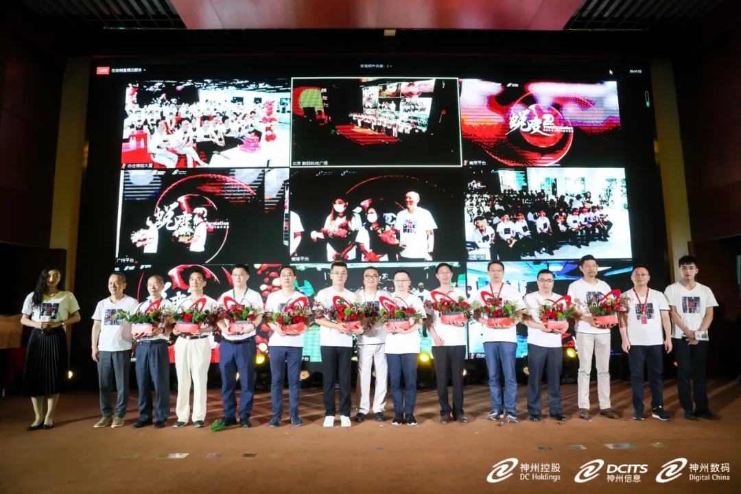 在二十年员工授勋环节,神州控股董事局副主席林杨、神州信息总裁李鸿春、ballbet贝博集团常务副总裁叶海强及其他分会场高管,分别为主会场及分会场20年员工代表授勋。