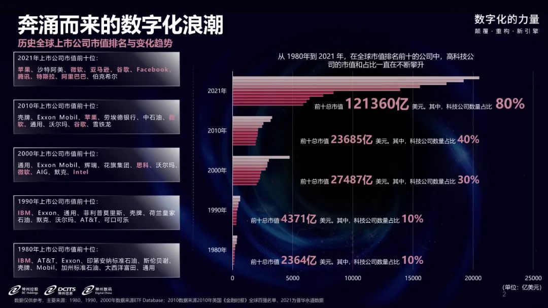 数字经济的发展成为现在的主流,人类正在进入一个数字化的时代,数字文明的阶段。古典经济学层面,核心是消费和供给。从供给侧来看,1980年的时候,全球十大上市公司的总值在2300亿美元左右,其中从事数字化技术的公司只有一家;到了2021年,全球前十大上市公司的总市值是12万亿美元,前十大上市公司里面已经有八家和数字技术相关的公司,增速极快。再看2010年的时候,前十大上市公司的总值是2.3万亿美金左右;在2021年世界上已经出现了两家上市公司,总市值均已经超过了2.5万亿美元。
